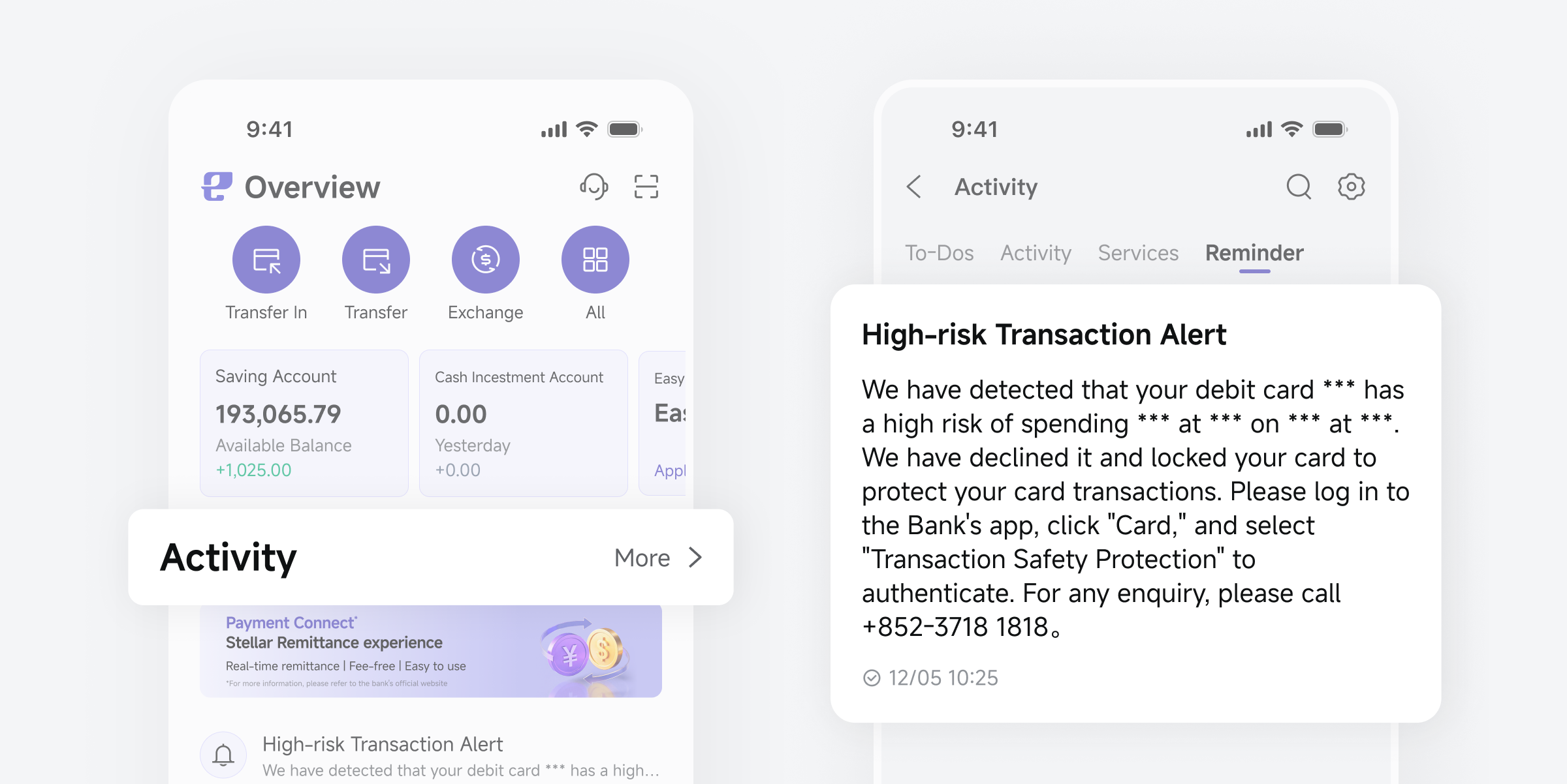 When your transaction triggers our security risk control rules, the transaction will be automatically declined, and you will be notified via App push, email, and SMS immediately to verify the transaction.