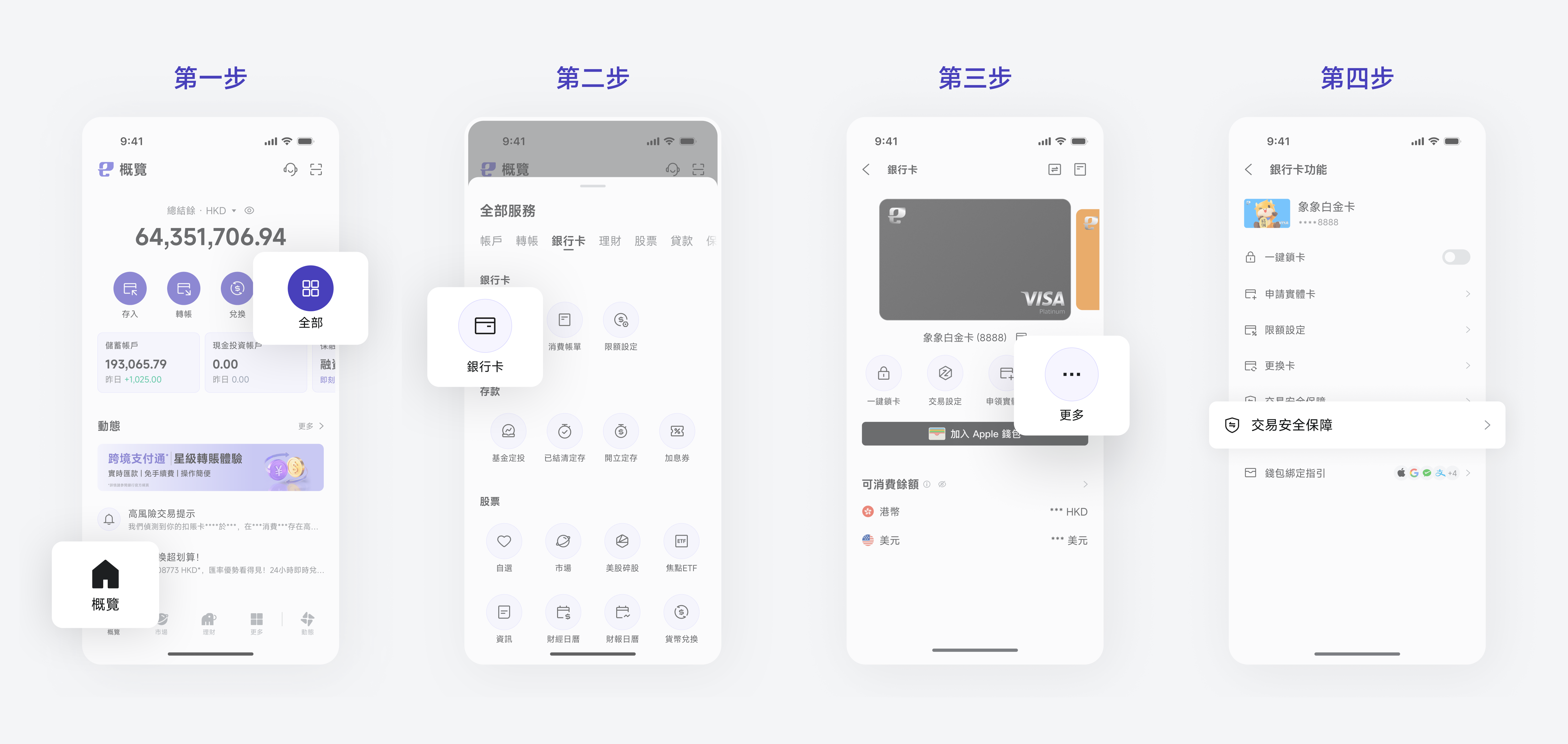 当你收到交易确认通知时,在 App 首页选择「全部」按钮,进入后点击「银行卡」,跳转至银行卡首页;在银行卡首页,依次点击「更多」→「交易安全保障」。
