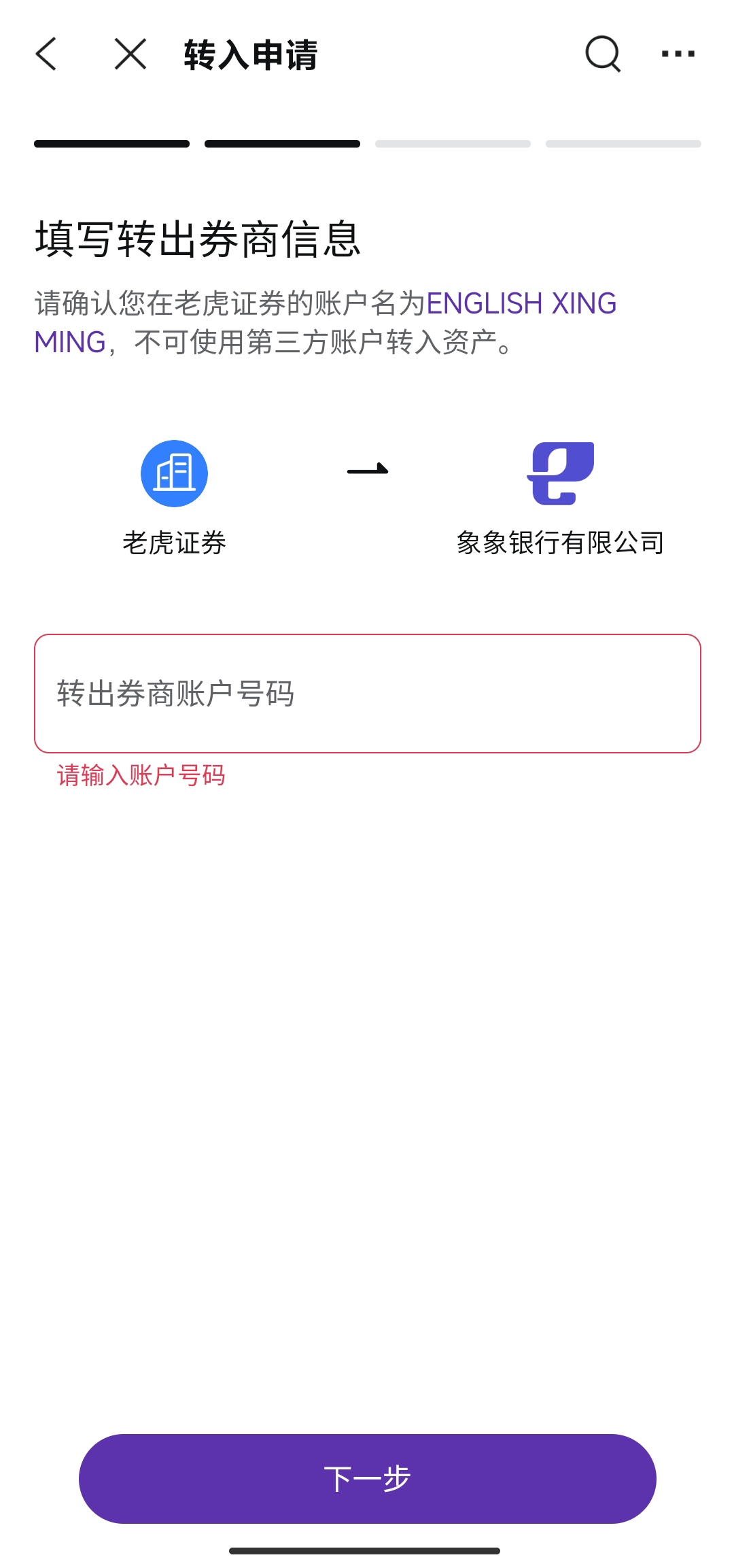 转出方信息:指在原有券商的相关信息。如:从A券商转出股票到象象银行,此处即选择「A券商」(如列表中未有对应券商,请选择其他券商)。