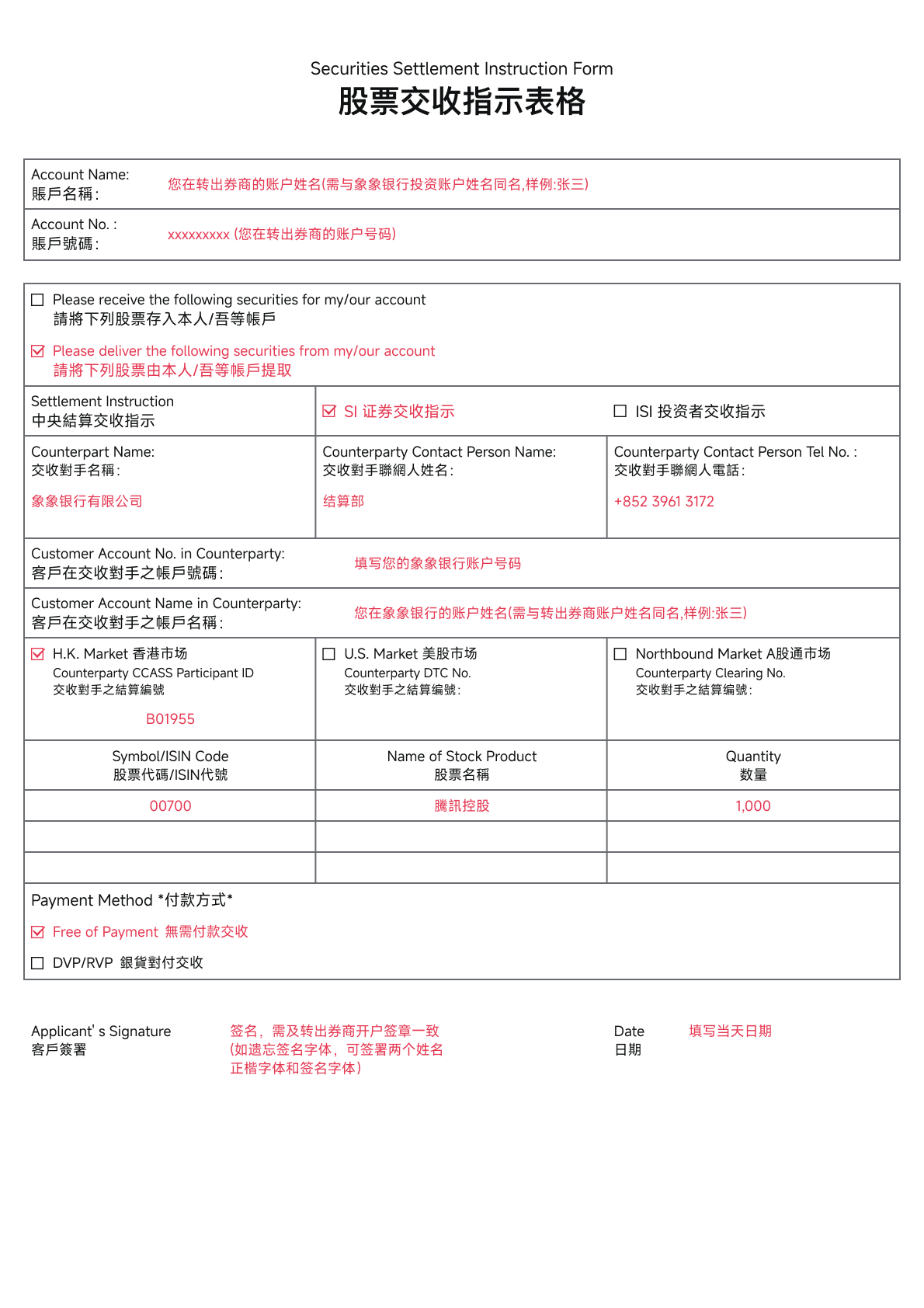 2.转入股票费用:象象银行一般不收取转入费用,但转入除牌港股除外(本行将就每支除牌港股收取500港币处理费)。转出券商可能收取费用,请确保您在转出券商账户中留有足够现金支付股票转出费用,否则可能导致转仓失败。