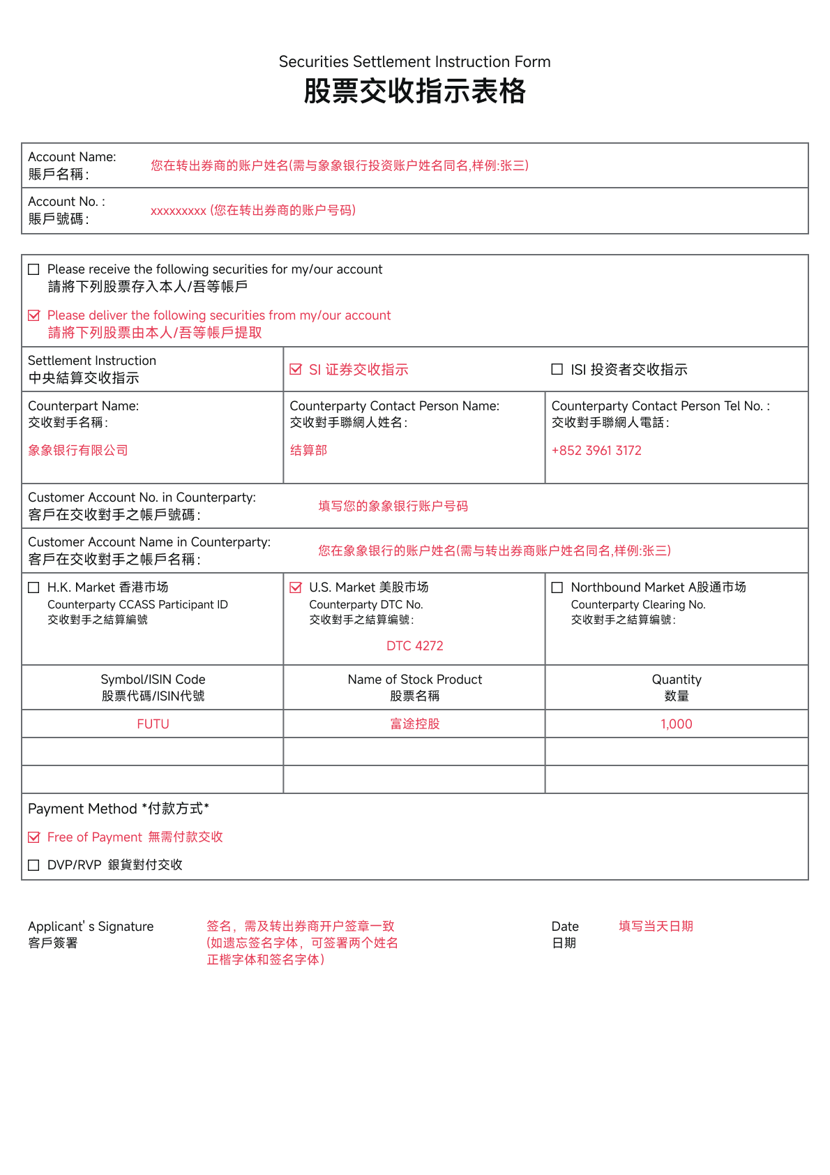 根据要转入的股票选择对应市场。如需转入不同市场的股票,请分开提交转仓指示。