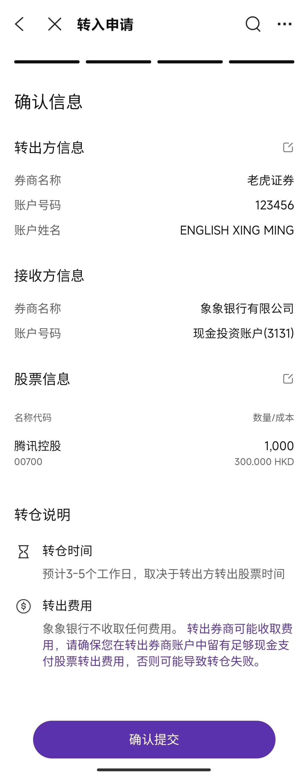 3.转入股票时间:转入港股,一旦对方转出股票,象象将在1-2个工作日存入客户账户;转入美股,需与接收方确认客户身份,转移时间较长预计3-15个工作日(转仓时间仅供参考,以双方实际处理时间为准)。