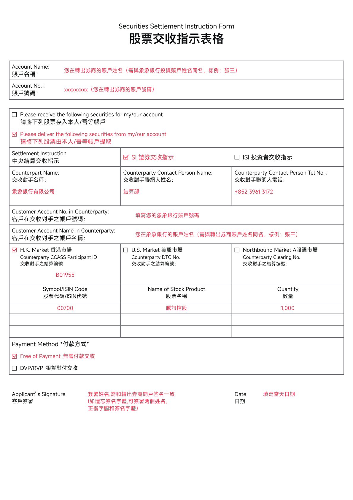 象象銀行的信息及表格填寫示例如下:
