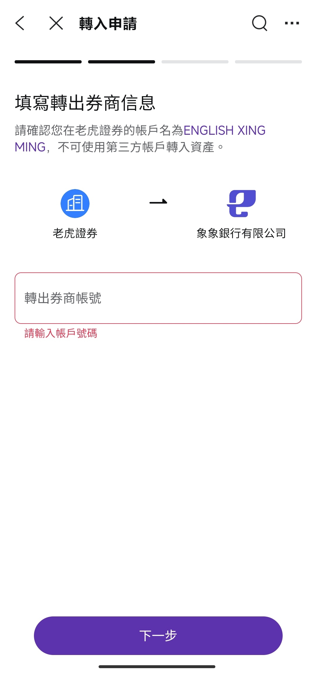 賬戶姓名:系統將默認顯示您在象象銀行的賬戶姓名。(您在對家券商的賬戶姓名需與您在象象的賬戶姓名保持一致)