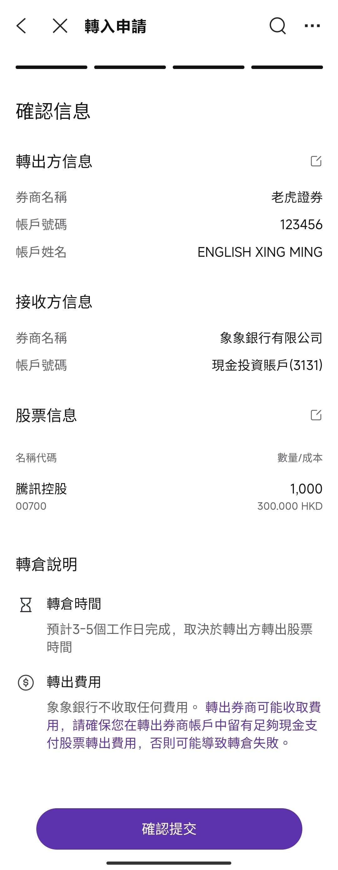 核對轉出方、股票代碼、股數的信息,確認無誤後提交指示。如填寫錯誤或漏填,請返回修改。