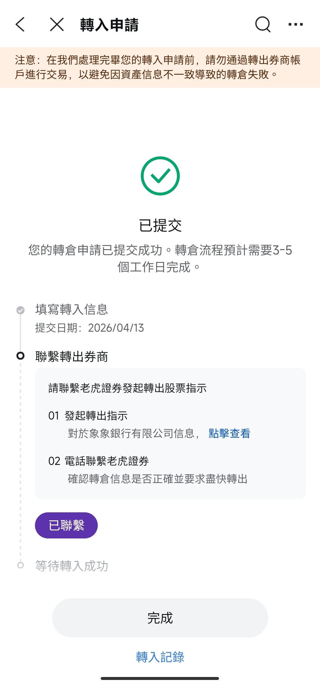 聯繫轉出方,提交轉出股票申請。由於各金融機構通知方式不一致,具體請以转出方要求為準。